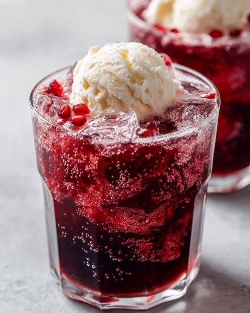 This elegant float blends the tart flavor of pomegranate with the warmth of bourbon and the creaminess of vanilla ice cream. The result is a stunning ruby-red dessert drink that’s as beautiful as it is delicious.