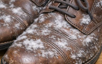 I pulled out shoes I haven’t worn all winter and found white fuzzy patches growing on the leather. What is this?