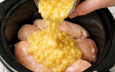 Dump cream style corn over chicken breasts, along with 2 ingredients, into slow cooker for a hearty meal that disappears faster than anything else