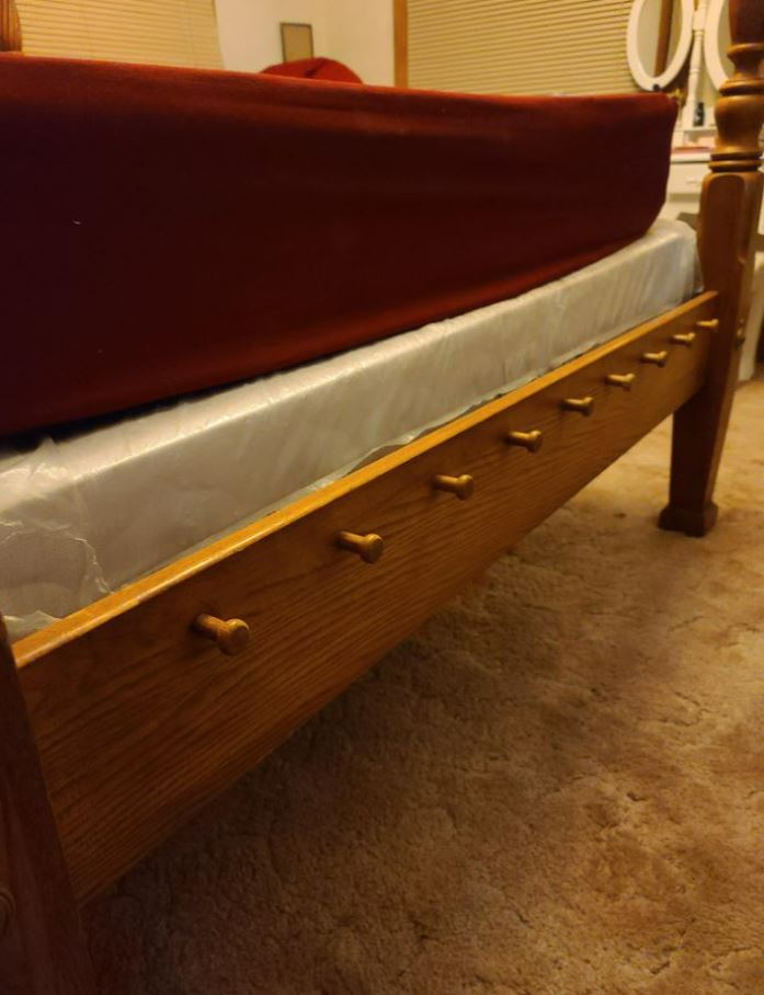 Ropes, however, do not continue to stay tight. In a few nights, or with a kid hopping on, you’d have a hammock situation. And so, people used these wooden pegs as part of like tightening the ropes. Pegs would slip into holes in the bed frame, and you’d crank things back into position, and everything was once again firm.